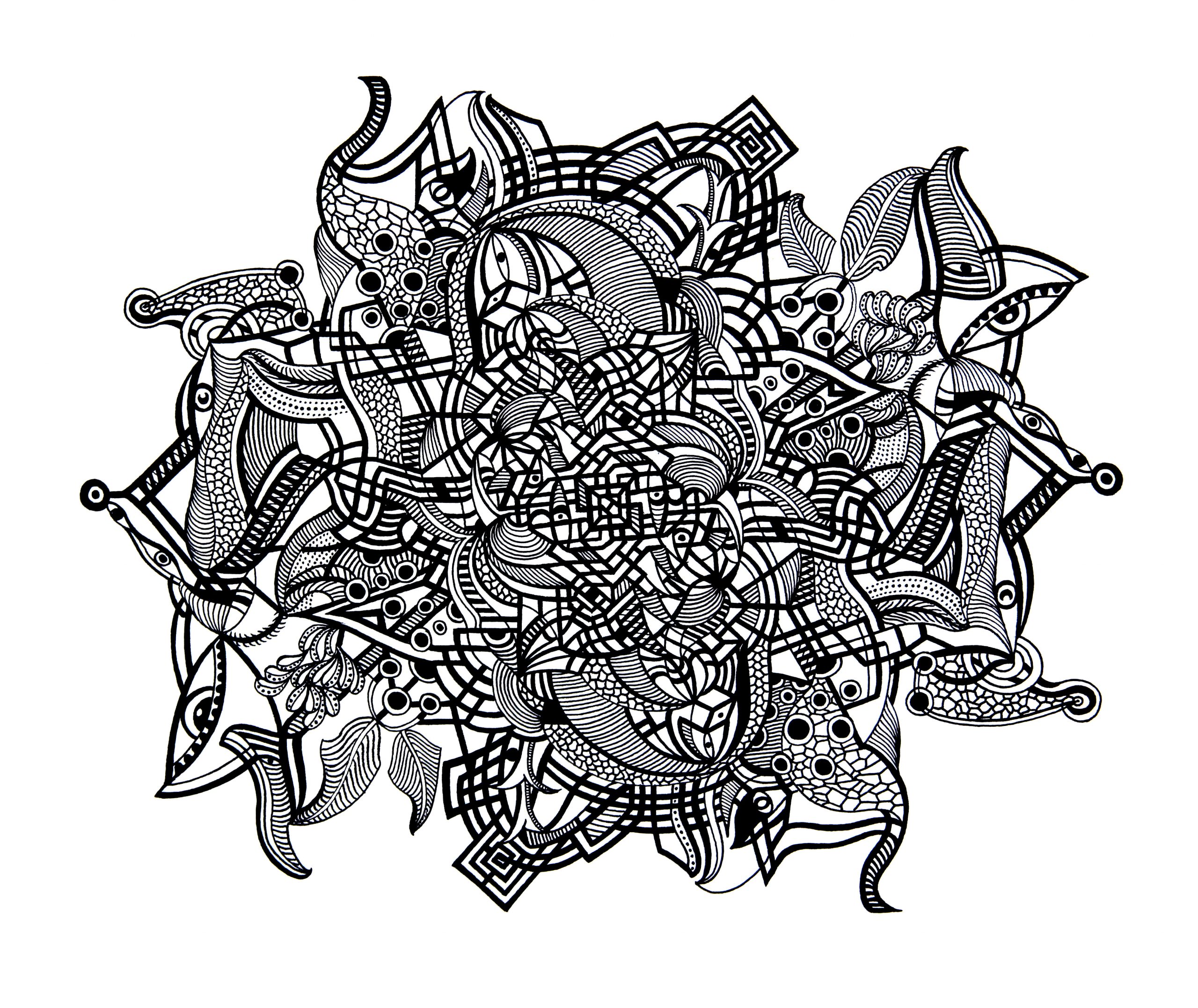 This piece was drawn freehand with black fine liners on paper, beginning with the centre square.