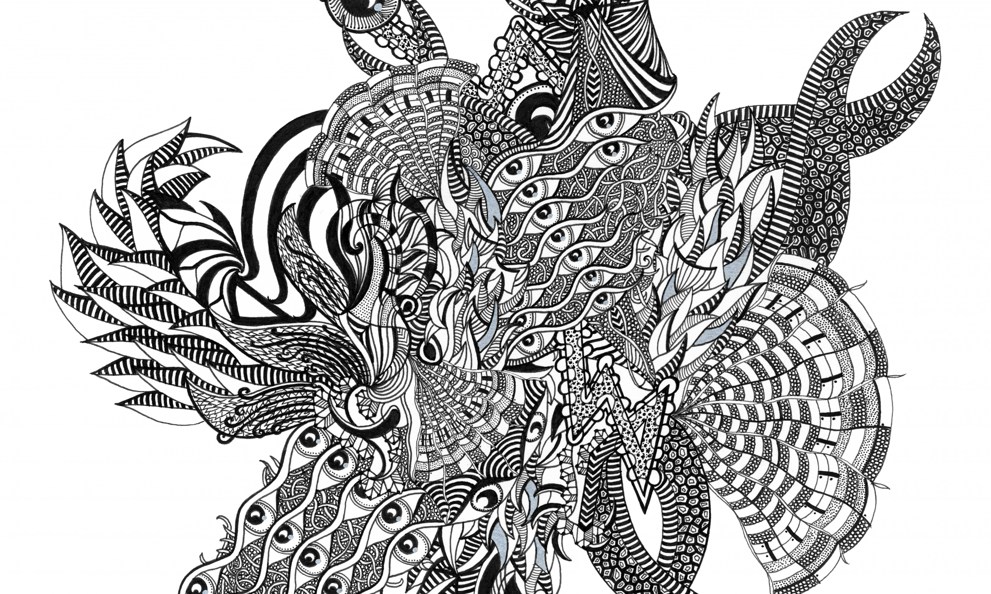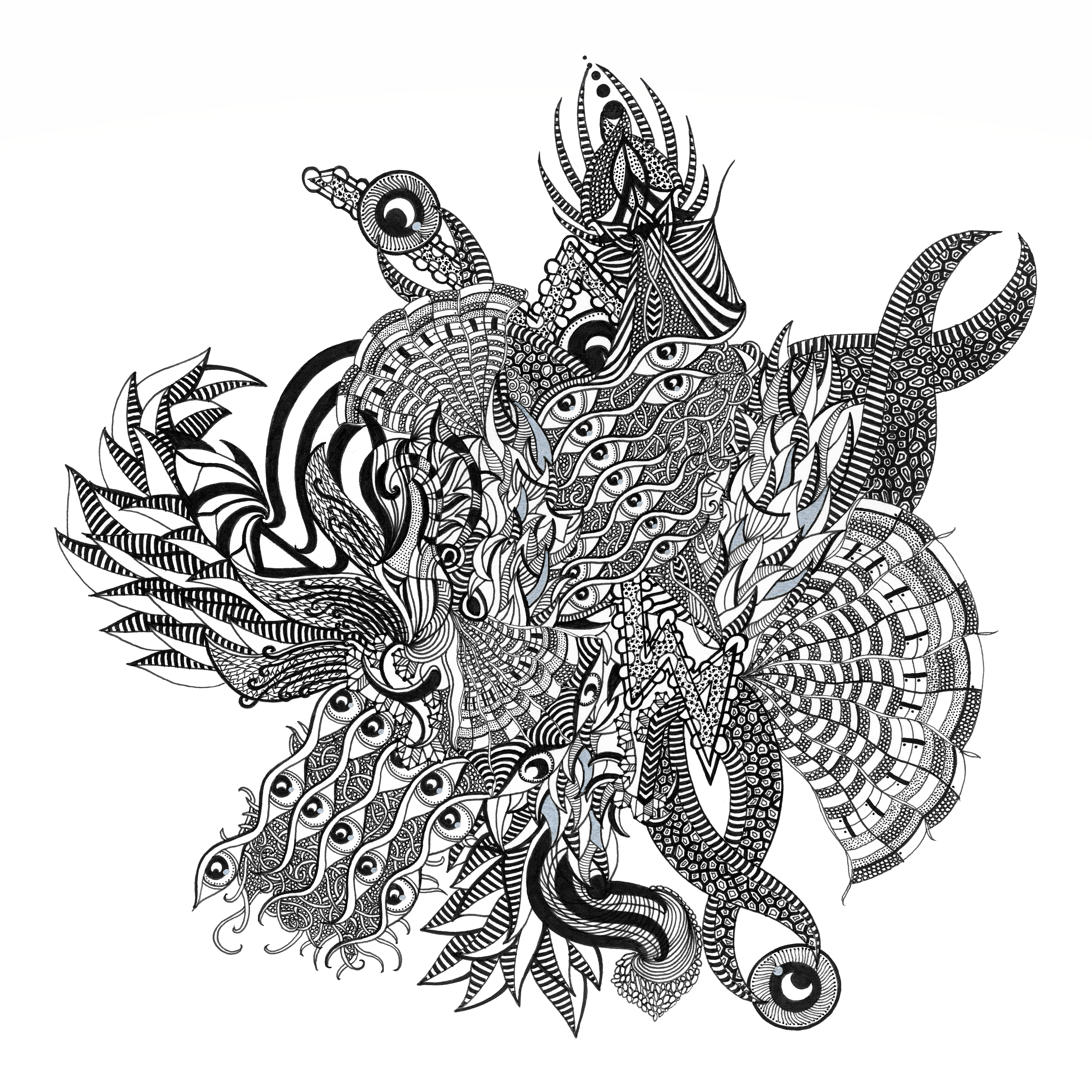 This piece was drawn using black fine liner and silver marker on paper.